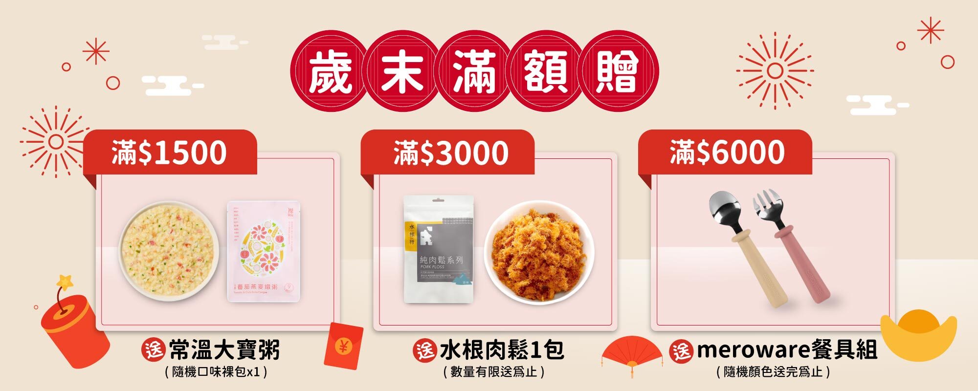 * 會員專屬寶寶粥、燉飯、烏龍麵、粥、調理包滿$1500送寶寶粥一包;$3000送水根肉鬆一包;$6000送meroware餐具組(訂單不累贈數量有限送完為止)