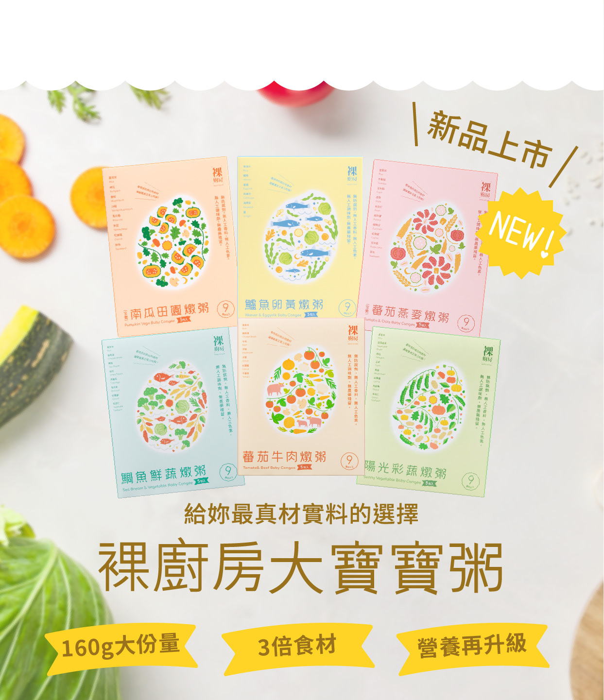 和營養師共同開發的裸廚房常溫大寶寶粥, 食材跟米3:1的食材比例讓寶寶的營養更豐富, 嚴格使用優質食材及花東富里米, 每包160克容量更升級, 而且每個口味都用成品通過SGS檢驗, 讓寶寶吃得開心, 媽媽更放心!