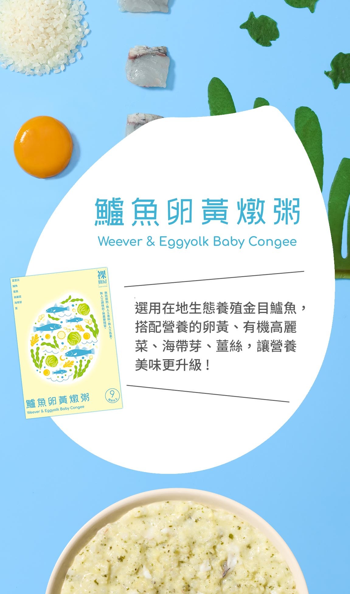鱸魚卵黃燉粥:水,鱸魚,白米,蛋黃,高麗菜,橄欖油,海帶芽,薑