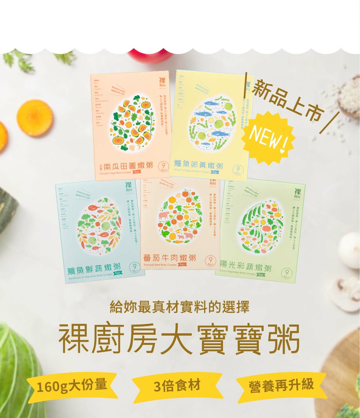 和營養師共同開發的裸廚房常溫大寶寶粥, 食材跟米3:1的食材比例讓寶寶的營養更豐富, 嚴格使用優質食材及花東富里米, 每包160克容量更升級, 而且每個口味都用成品通過SGS嬰幼兒食品檢驗, 讓寶寶吃得開心, 媽媽更放心!