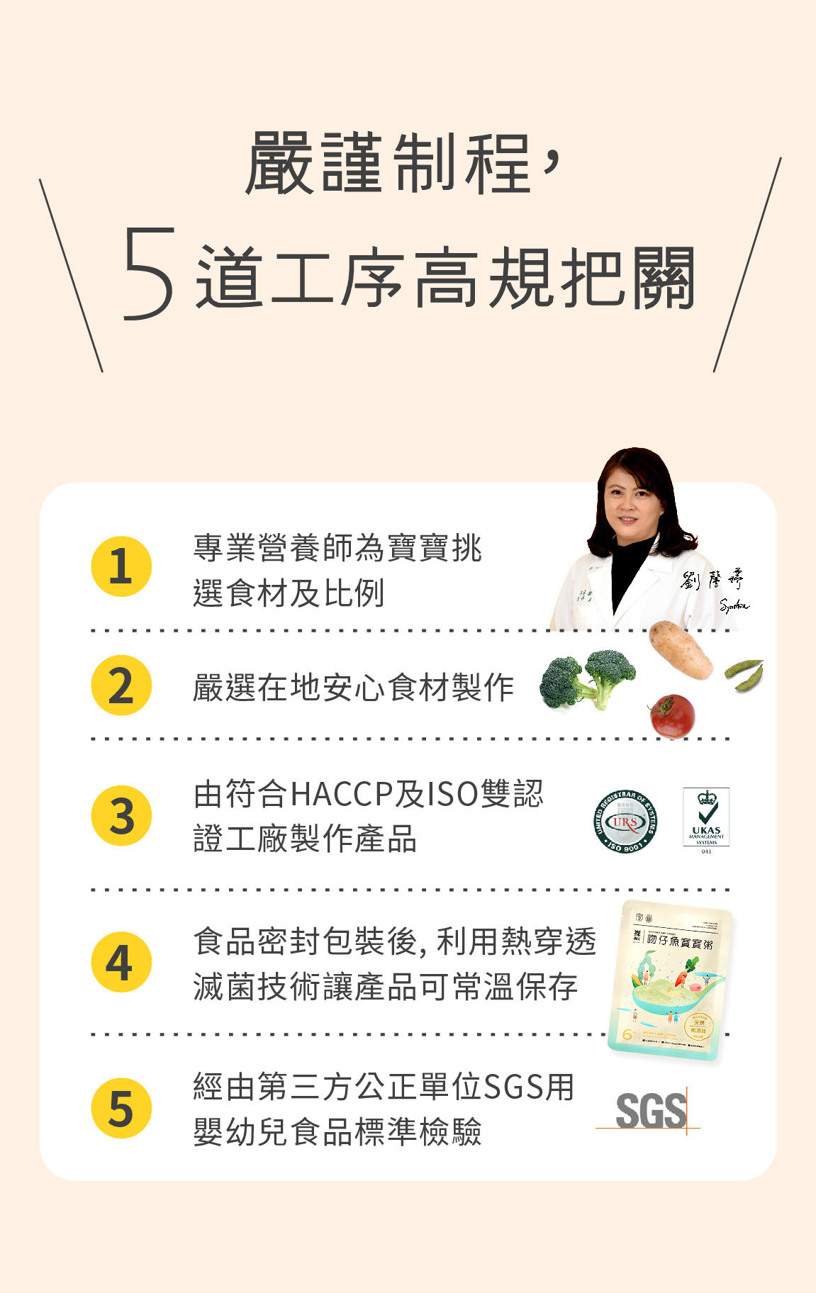 和營養師共同開發的裸廚房常溫大寶寶粥, 食材跟米3:1的食材比例讓寶寶的營養更豐富, 嚴格使用優質食材及花東富里米, 每包160克容量更升級, 而且每個口味都用成品通過SGS嬰幼兒副食品檢驗, 讓寶寶吃得開心, 媽媽更放心!