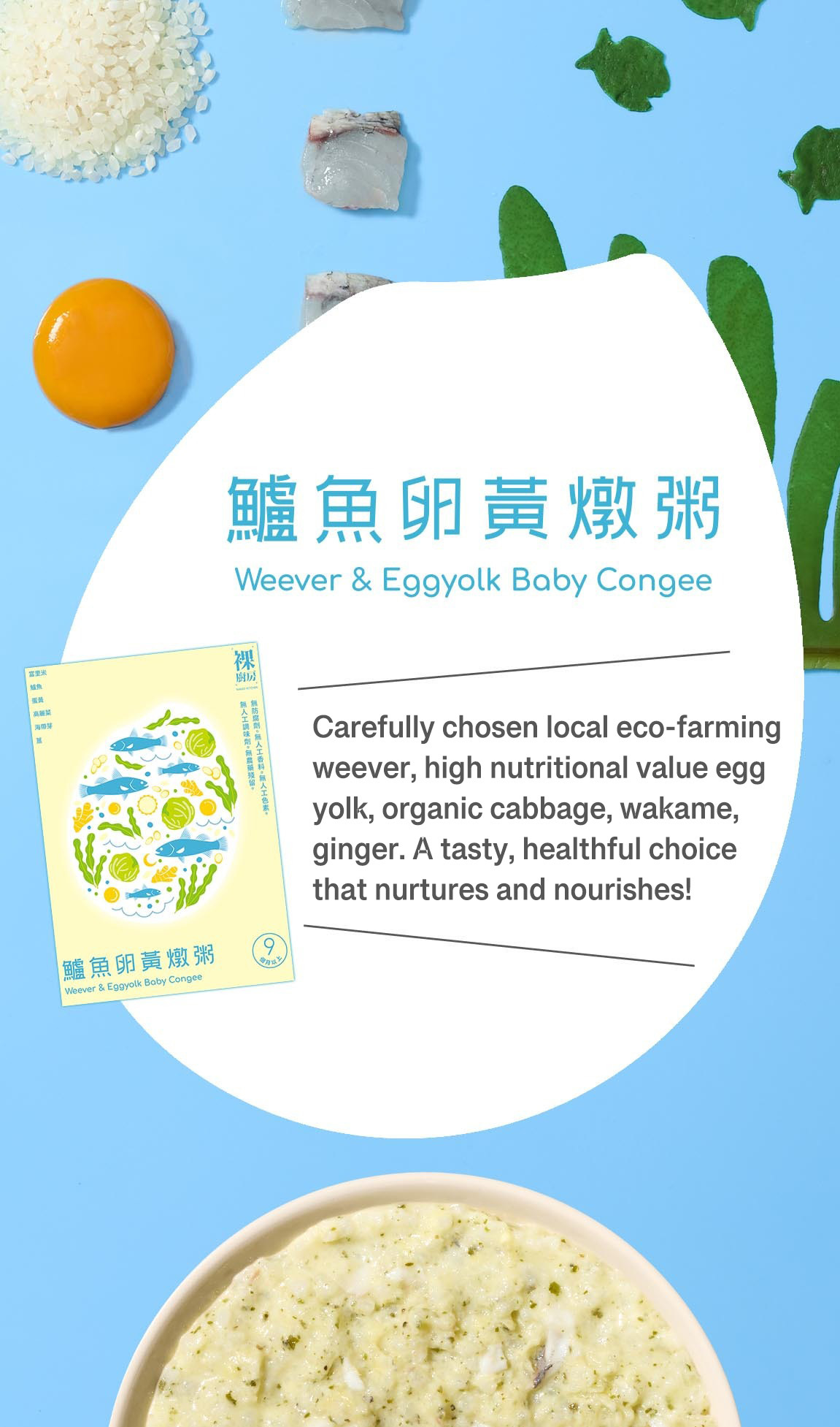 Weever & Eggyolk Baby Congee:Water, Weever, White Rice, Egg Yolk, Cabbage, Olive Oil, Wakame, Ginger.