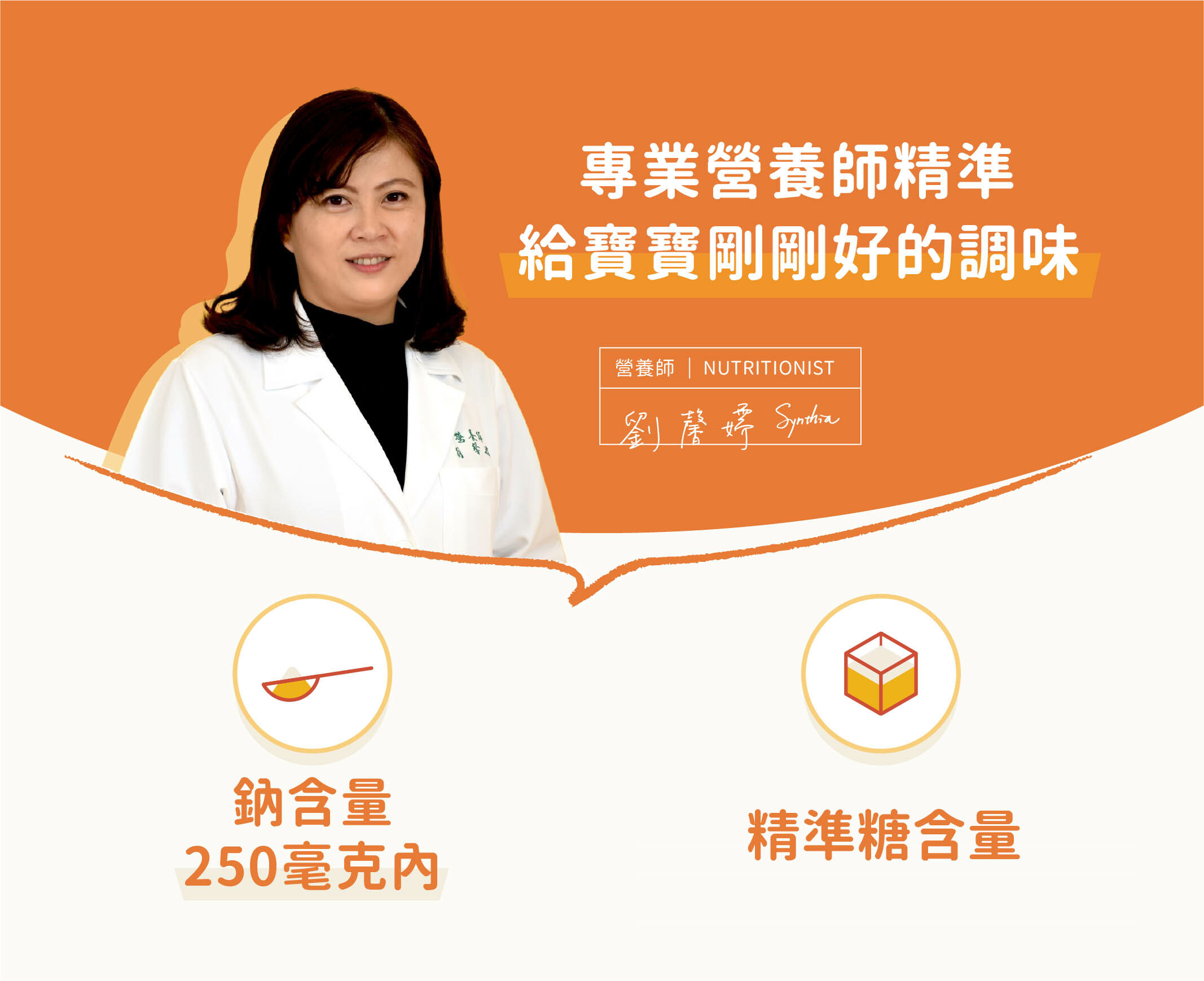 和營養師共同開發的兒童無添加調理包系列, 不使用人工添加劑, 並且嚴格將每一份調理包的鈉含量控制在250毫克內, 嚴格使用優質台灣在地食材及雲林快樂豬, 而且每個口味都用成品通過SGS檢驗, 讓寶寶吃得開心, 媽媽更放心!