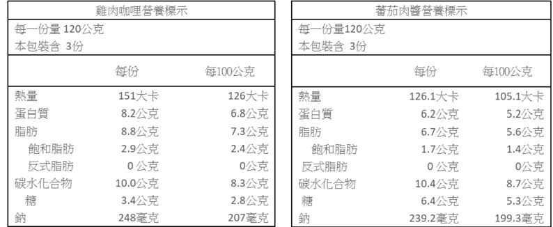 雞肉咖哩:豬高湯[水、豬肉(台灣)]、雞腿肉、馬鈴薯、紅蘿蔔、南瓜、洋蔥、大豆油、奶粉、麵粉、糖、奶油[殺菌乳脂]、蒜、碘鹽、咖哩粉[胡荽、薑黃、薑母、馬芹子、小荳蔻、葛婁子、葫蘆巴、蒜粉、黑胡椒、肉桂、丁香、紅辣椒、豆蔻、小茴香、月桂葉]、洋蔥粉、香芹粉、香蒜粉、薑黃粉、胡荽粉、小茴香粉、孜然粉。